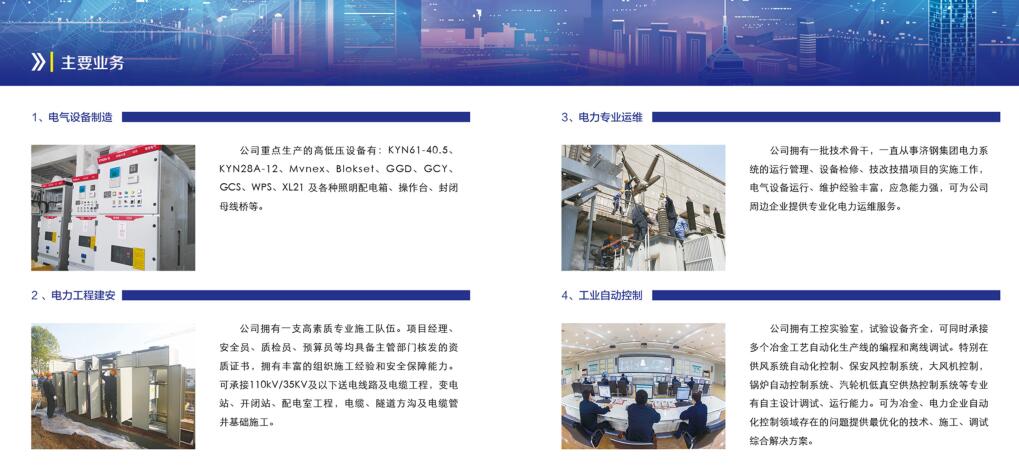 公司目前有《承装(修、试)电力设施许可证》承(装、修)三级、承试四级资质,电力工程施工总承包叁级资质和建筑机电安装工程专业承包叁级资质。具备从事 110千伏以下电压等级电力设施的安装、维修和35千伏以下电压等级试验的资质;可承担单机容量10万千瓦及以下发电工程、110千伏及以下送电线路和相同电压等级变电站工程的施工;可承担单项合同额 1000 万元以下的各类机电设备、线路、管道的安装工作。